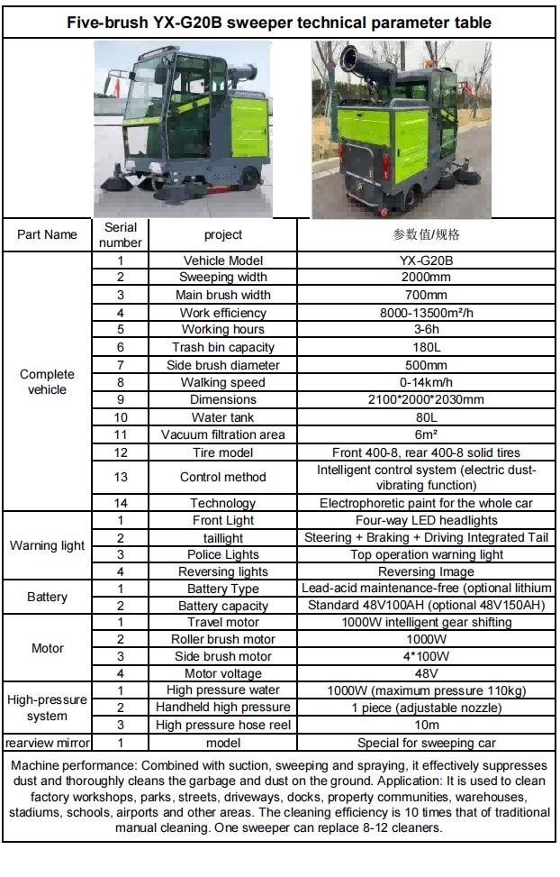 अनुप्रयोग: इसका उपयोग फैक्टरी कार्यशालाओं, पार्कों, सड़कों, ड्राइववे, गोदी, संपत्ति समुदायों, गोदामों, स्टेडियमों, स्कूलों, हवाई अड्डों और अन्य क्षेत्रों को साफ करने के लिए किया जाता है।
