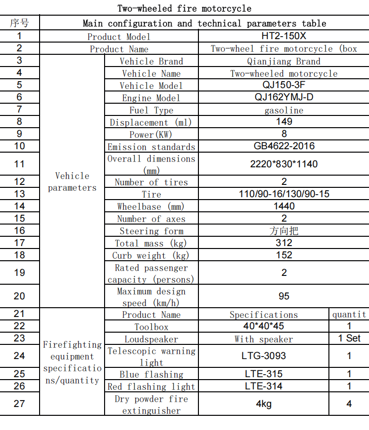 ऑल-टेरेन फ़ायरफाइटिंग मोटरसाइकिल का ऑफ-रोड प्रदर्शन उत्कृष्ट है। यह तेजी से और लचीले ढंग से ऊबड़-खाबड़ पहाड़ी रास्तों या संकरी गलियों में अग्निशमन और बचाव कार्य कर सकता है। अचानक आग लगने के खतरे की स्थिति में, यह आग के स्रोत को बुझाने के लिए एक लड़ाकू दल बनाने के लिए 3 लोगों को ले जा सकता है।